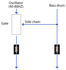 Penguatan kick drum dengan osilator: terkadang suara kick drum terekam melempem. Apakah salah mikrofon, atau posisi yang salah? Suara instrumen atau musisinya? Salah satu cara untuk menyelesaikan masalah ini adalah dengan menambah beberapa frekuensi rendah yang hilang pada suara kick drum. Bisa dilakukan dengan konfigurasi berikut: